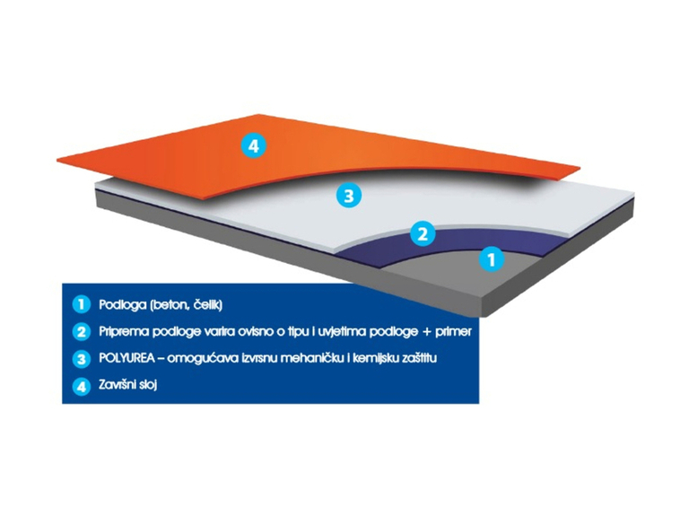 Polyurea je polimer formiran od dvije komponente (izocijanata i amina) koje formiraju 100% čvrsti, kontinuirani vodootporni sloj bez štetnih utjecaja na okoliš. Koristi se za zaštitu podloge od abrazije i korozije.